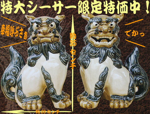 【貴重】島武己作 シーサー価格: 398,000円レビュー評価: 0.0 レビュー数:0 内 容 2体1組 商品説明 島武己 作のシーサーを石垣島よりお届け そのズッシリした感触が深い味わいを醸し出してます! シーサーは、2体で対になっています。 オスのシーサーは、口をあけ幸せを呼び込む意味があり、メスのシーサーは、口を閉じ一度つかんだ幸せを放さない意味がこめられています。 サイズ:幅約19cmx高さ約22cmx奥行約12cm |