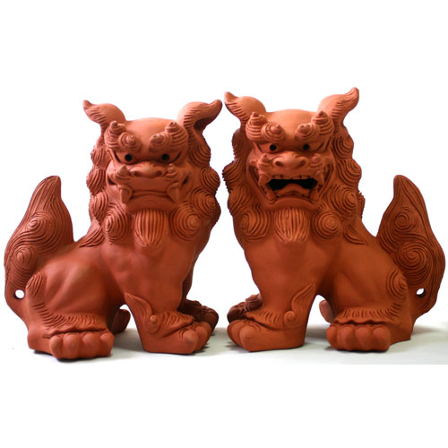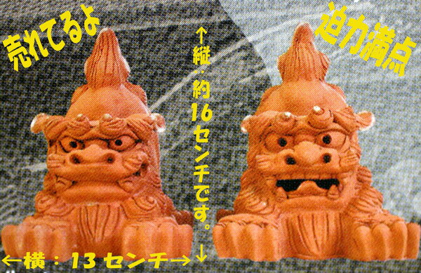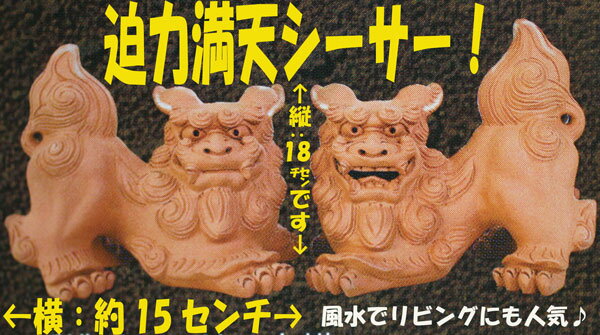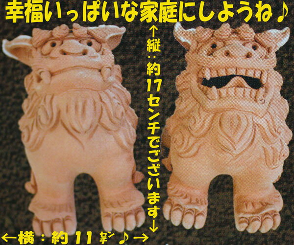 ★ 商品内容 迫力満点で大人気!琉球焼きシーサー:風水、開運に♪(ペア) ★ サイズ 1体の大きさ 縦:約20センチ×横:約15センチ×奥行:10センチ ★ 配送方法 ※今だけ、送料、代引き当社負担デス♪ ★ オススメポイント! 沖縄県内でもこれだけ大きいシーサーを玄関に飾っている御自宅はありません!大きな家にもピッタリですが、マンション等の玄関先に飾るのも風格があり良いと思います。とにかくこのサイズになりますと「重厚感」「風格」がございます。リビング等の広めのお部屋にはとても縁起の良い、「幸福黄金獅子大サイズ」もオススメです♪店長の私は玄関、子供部屋、寝室に「風水シーサー」、リビングに「幸福