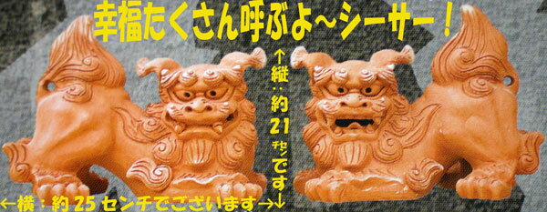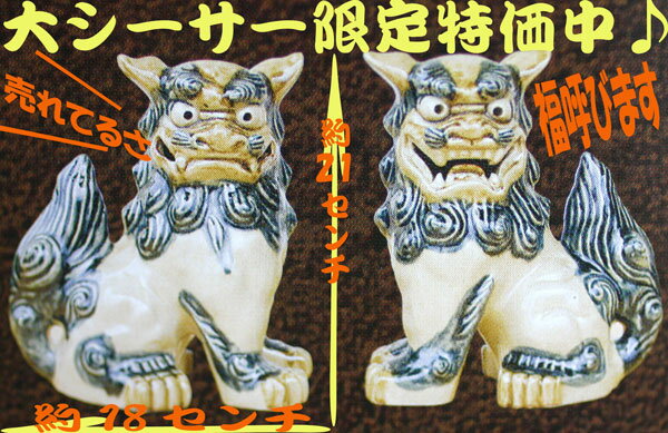 ★ 商品内容 楽天人気のシーサー:開運に♪(ペア) ★ サイズ 縦:約21cm 横:約23cm ★ 配送方法 ※今だけ、送料、代引き当社負担デス♪ ★ オススメポイント! 楽天市場で大人気のシーサーちゃん達です!!お客様の御評価通り、「重厚感」「風格」がございます。金運、開運、風水強化をしたい方にオススメ致します♪年末年始は風水シーサー各種が物凄く注文がございます。在庫も限りがございますので、お早めのご購入をオススメ致します。この機会をお見逃さずに♪※商品のお問い合わせは、ご購入はお電話でもご対応致します。お気軽にどうぞ♪電話:098-871-1996(月?金:9:00-17:30)※次のシー