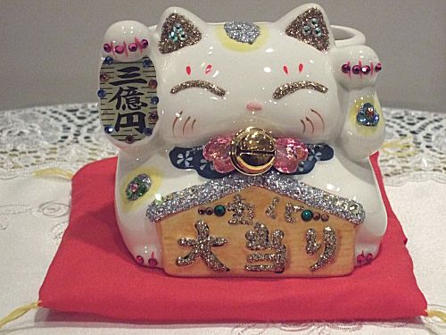 キラキラ・ゴージャス♪大当たり招き猫(貯金箱):ホワイト10P25Sep09価格: 3,990円レビュー評価: 0.0 レビュー数:0 ■サイズ:高さ約9cm ■材質:陶器■赤色のお座布団付きラメやラインストーンでデコレーションし、左手に3億円、裏にはラメで「ジャンボ」と書かれたゴージャス招き猫!宝くじを差し込んでおけるようになっているこの招き猫に拝めば当たるかも!?貯金箱にもなってます。 |